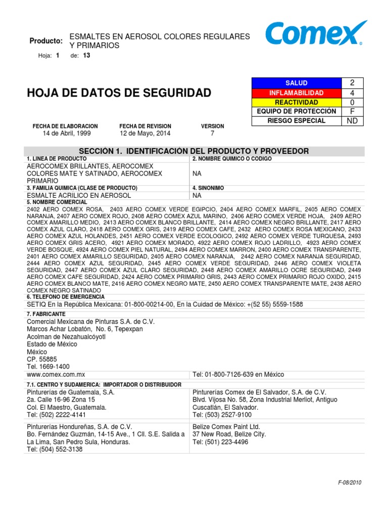 13 f-082010 hoja de datos de seguridad riesgo especial fecha de elaboracin fecha de revisin versin 14 de abril 1999 12 de mayo 2014 7 seccin 1. PINTURAS EN AEROSOL COLORES SLIDOS TRUPER ESMALTES ALQUIDALES Y ESMALTE ESTIRENADOS Intervencin.
